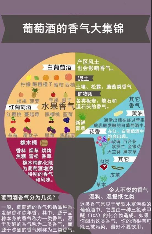 在葡萄酒的世界中至少存在著上百種不同的氣味。不是所有氣味都是容易識別的。為了鑒別,品酒師把這些氣味進行分類重組。每組類別的定義及其包含的氣味各不相同,如水果可以分為柑橘類、紅色水果、黑色水果、熱帶水果等,糕點類可以分為黃油、餅干、奶油面包、吐司等,另外還有花卉類、木質類、糖果類、植物類、香料類、動物類和礦物類等,每一個類別你需要有一些香氣記憶的儲備(詳見附圖)。