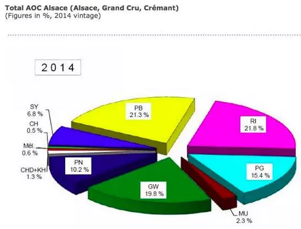 官方給出的統(tǒng)計(jì)數(shù)據(jù),2014年在阿爾薩斯三大原產(chǎn)地命名產(chǎn)區(qū) (AOC) 中,白皮諾的種植面積占到所有葡萄品種的21.3%,與種植面積最廣的雷司令 (21.8%) 不分伯仲。
