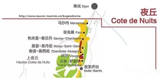 夜丘的特級園和一級園坐落在10個產酒村內,其中熱夫雷-香貝丹Gevrey-Chambertin、伏舊Vougeot、沃恩-羅曼尼Vosne-Romanee和夜圣喬治Nuits-Saint-Georges等村最為出名。