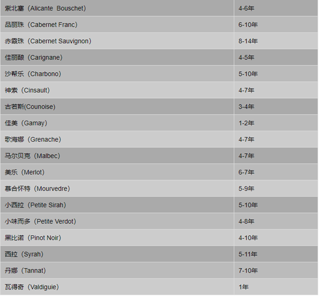 然而,即使是在超市里面,我們還是能夠輕易買到具備陳年潛力的葡萄酒,特別是紅葡萄酒(當(dāng)然這些酒大多價(jià)格不菲)。具體而言,一瓶葡萄酒的陳年潛力基本上取決于其葡萄品種,不同的葡萄品種其“適飲期”也大不一樣。以下是一份各主要紅葡萄品種的適飲期指南,可供各位葡萄酒愛好者參考: