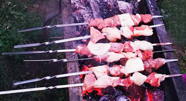 烤羊肉串是一種流行于中東、南亞、中亞、地中海、東亞等多個地區的羊肉菜式。在中國,烤羊肉串的歷史可追溯至東漢時期,20世紀80年代以來隨著時代的發展,在大江南北傳揚開來。烤羊肉串看似簡單,要保證羊肉既入味又鮮嫩卻并非易事,工序也十分考究——取新鮮羊肉或切片切塊,串穿在細鐵釬上,放置在烤爐上焙烤,再撒上些辣子面、胡椒粉和孜然粉等,不斷翻動,烤至雙面金黃,肉質熟透。