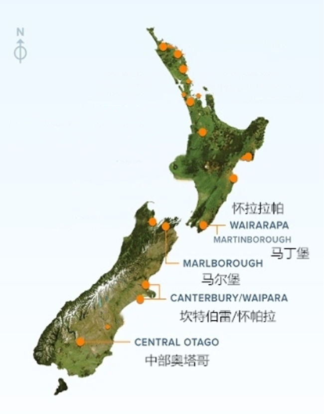 黑皮諾占新西蘭紅葡萄品種總種植量的72%,它也是該國種植面積第二大的品種,僅次于長相思(Sauvignon Blanc)。由于黑皮諾更適合在較涼爽的氣候下生長,因而主要分布在北島南端以及南島幾大產區。各產區的土壤和氣候等自然條件豐富多樣,釀出的黑皮諾葡萄酒也具有繽紛多彩的風格。