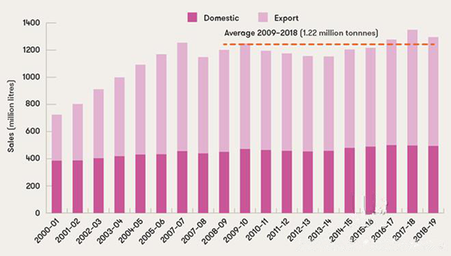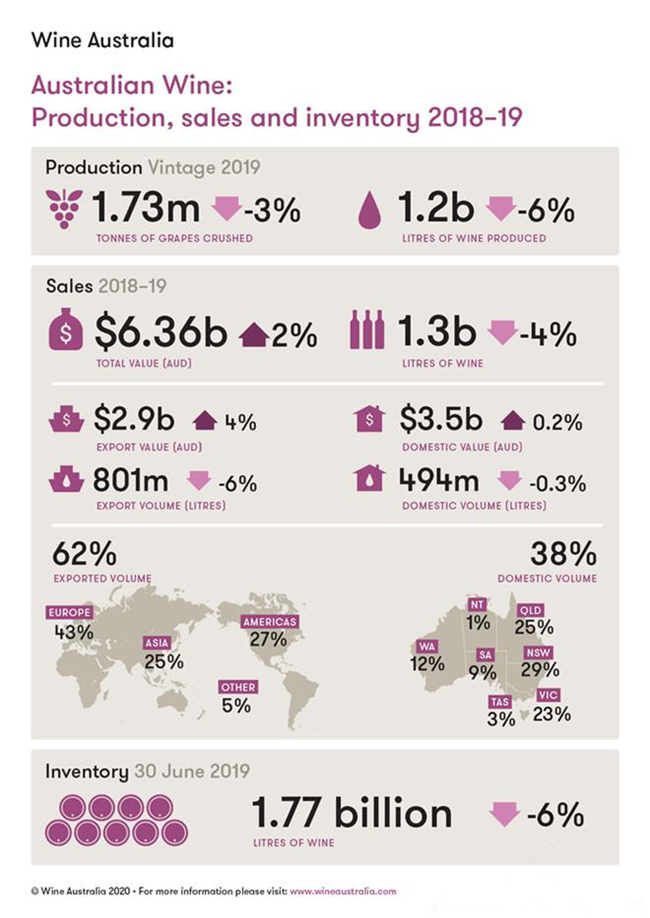 根據澳大利亞葡萄酒協會(Wine Australia)今天發布的《2019年葡萄酒生產銷售和庫存報告》顯示,澳洲葡萄酒總銷量連續第二年超過產量,這表明供應趨緊并提升了澳大利亞葡萄酒行業的價值。