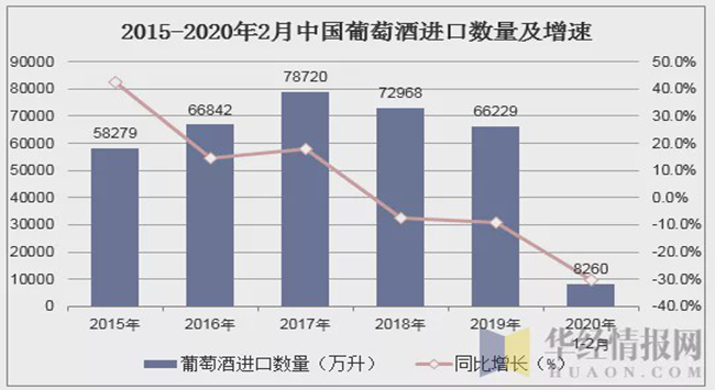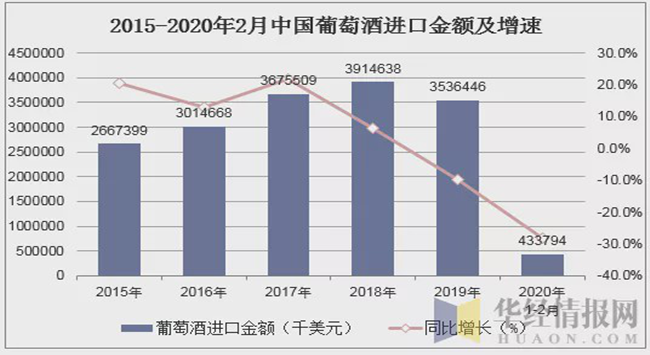 華經(jīng)產(chǎn)業(yè)研究院數(shù)據(jù)顯示:2020年1-2月中國(guó)葡萄酒進(jìn)口數(shù)量為8260萬(wàn)升,相比上年同期減少了3616.5萬(wàn)升,降幅為30.4%;進(jìn)口金額為433794千美元,相比上年同期減少了171071千美元,降幅為28.3%;2020年1-2月中國(guó)葡萄酒進(jìn)口均價(jià)為5.252美元/升。