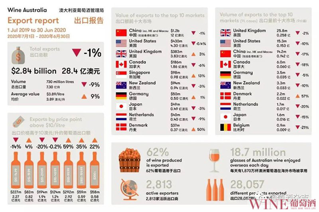 8月5日,澳大利亞葡萄酒管理局發布截至2020年6月的最新出口報告。