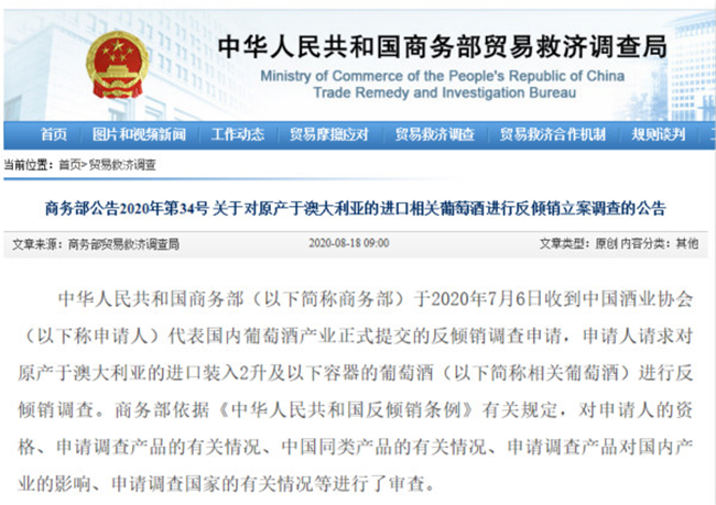 根據(jù)上述審查結(jié)果,依據(jù)《中華人民共和國反傾銷條例》第十六條的規(guī)定,商務(wù)部決定自2020年8月18日起對(duì)原產(chǎn)于澳大利亞的進(jìn)口相關(guān)葡萄酒進(jìn)行反傾銷立案調(diào)查。現(xiàn)將有關(guān)事項(xiàng)公告如下: