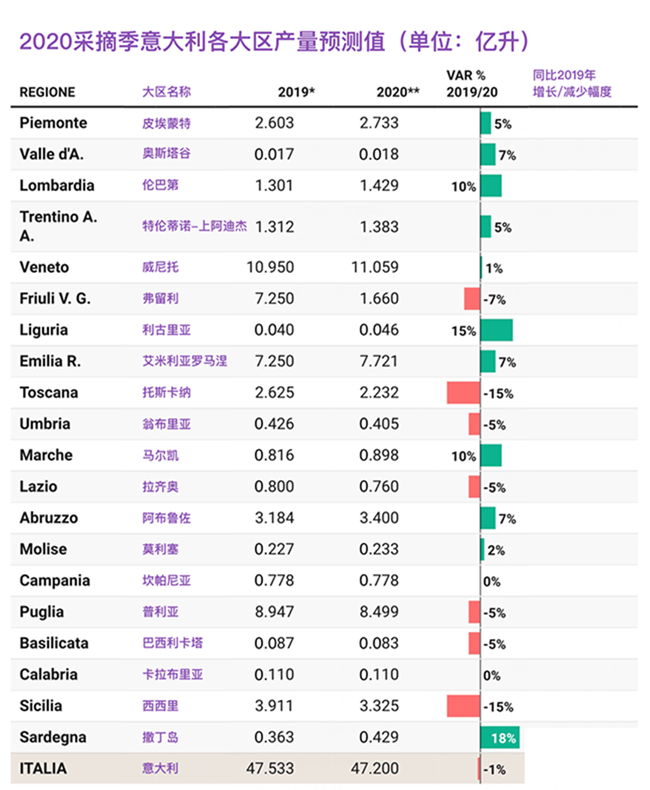 9月初,意大利釀酒師及釀酒技術協會 (Assoenologi)、意大利農業及食品市場研究所(ISMEA)和意大利葡萄酒聯合會(UIV)共同發布了《2020年意大利葡萄年份預測報告》。報告顯示,2020年意大利葡萄酒產量約達47.2億升,同比2019年略微下降1%。今年意大利政府及各大葡萄酒產區協會為緩解新冠疫情對葡萄酒產業的沖擊,力推各項葡萄減產措施,這是今年意大利葡萄酒產量輕微下降的主要原因。