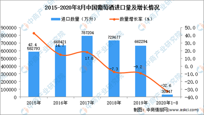 2020年1-8月中國葡萄酒進口量及金額增長情況
