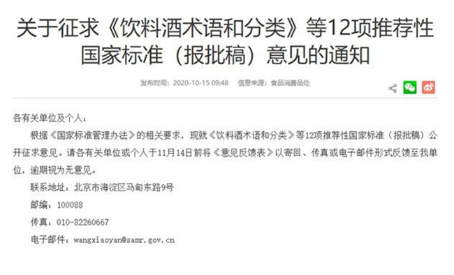 日前,國(guó)家市場(chǎng)監(jiān)督管理總局發(fā)布了“關(guān)于征求《飲料酒術(shù)語(yǔ)和分類》等12項(xiàng)推薦性國(guó)家標(biāo)準(zhǔn)(報(bào)批稿)意見(jiàn)的通知”,根據(jù)《國(guó)家標(biāo)準(zhǔn)管理辦法》的相關(guān)規(guī)定,《飲料酒術(shù)語(yǔ)和分類》等12項(xiàng)推薦性國(guó)家標(biāo)準(zhǔn)已完成報(bào)批稿,涉及釀酒、鹽業(yè)、白酒等標(biāo)準(zhǔn)化技術(shù)委員會(huì)。