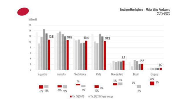 與2019年的產(chǎn)量相比,南美洲是南半球產(chǎn)量下降幅度最大的地區(qū)。阿根廷因惡劣天氣條件,2020年的葡萄酒產(chǎn)量大幅下降至10.8 mhl。智利因干旱,與2019年相比下降了13%。