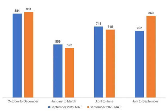 在截至2020年9月的12個月中,出口額的增長主要受到了英國和中國大陸的良好出口表現(xiàn)的推動。尤其在這12個月中的最后一個季度,這種漲勢尤為強(qiáng)勁。