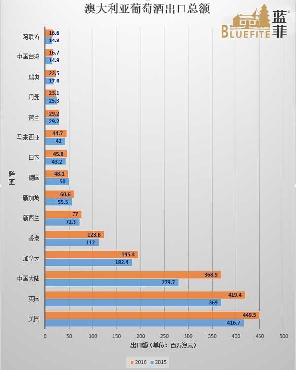 2016年的《澳大利亞葡萄酒出口報(bào)告》顯示,2015年6月至2016年6月,澳大利亞的葡萄酒出口額達(dá)到21.1億美元(約人民幣140億9290萬(wàn)元),同比增長(zhǎng)11%;出口量則達(dá)到7億2,800萬(wàn)升,同比增長(zhǎng)0.5%。