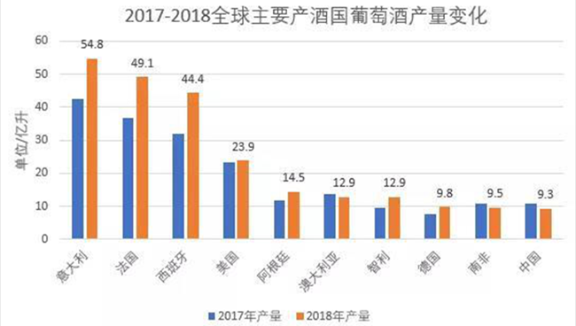 據(jù)OIV數(shù)據(jù)顯示,2018年全球葡萄酒產(chǎn)量292.3億升,較2017年增加了17%。排名前十的國(guó)家分別是:意大利54.8億升、法國(guó)49.1億升、西班牙44.4億升、美國(guó)23.9億升、阿根廷14.5億升、智利12.9億升、澳大利亞12.9億升、德國(guó)9.8億升、南非9.5億升、中國(guó)9.3億升。