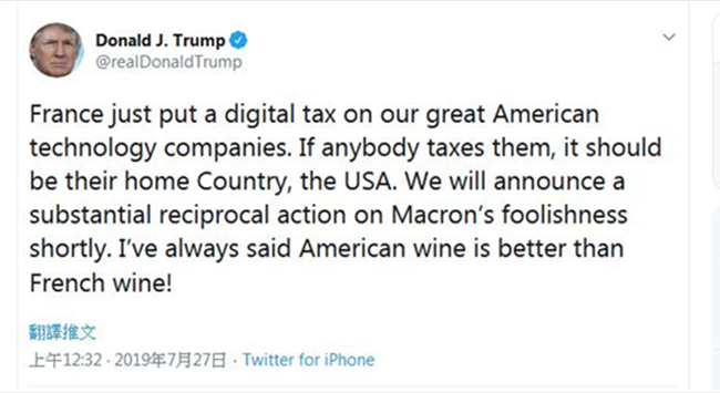 作為對法國近期宣布對全球科技巨頭征收數字服務稅的回應,據美國《紐約時報》報道,特朗普26日先是在推特上表示,“法國剛剛對我們偉大的美國科技公司征收一項數字稅,如果說有人要向他們征稅,那也應該是他們的祖國——美國。”