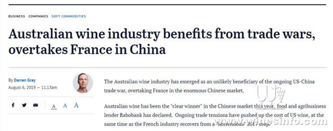 2018年澳洲對中國葡萄酒出口量上漲19.8%,且在2019年的前4個月中更是上漲了25.7%。(網(wǎng)頁截圖/《時代報》)
