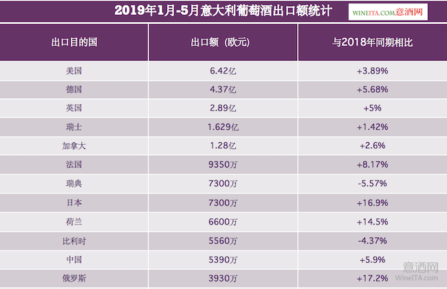 在今年前5個月意大利葡萄酒的各出口國中,表現最積極的海外市場仍然是美國,其次是德國和英國。在2019年前五個月,意大利對美國的葡萄酒出口額達到了6.42億歐元,較2018年同期增加了3.89%。