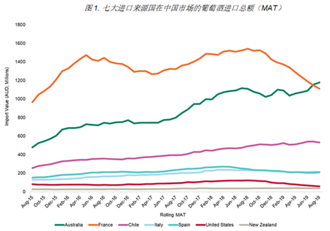 圖1.七大進口來源國在中國市場的葡萄酒進口總額 (MAT)