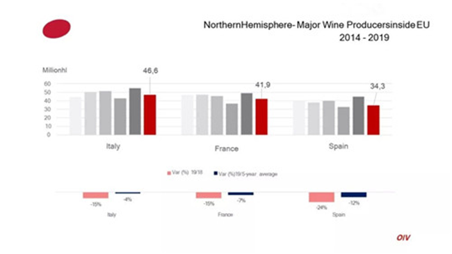 包括法國(guó)、意大利、西班牙在內(nèi)的葡萄酒主產(chǎn)國(guó)產(chǎn)量均有不同程度下降。OIV的數(shù)據(jù)來(lái)自28個(gè)國(guó)家,占全球葡萄酒產(chǎn)量的85%。