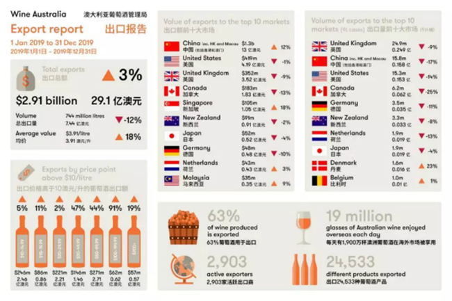 澳大利亞葡萄酒協(xié)會(huì)(Wine Australia)今天上午發(fā)布的數(shù)據(jù)顯示,在截至2019年12月的12個(gè)月里,澳大利亞葡萄酒出口總額增長(zhǎng)了3%,達(dá)到29.1億美元。