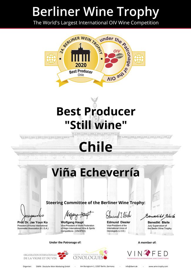 與此同時(shí),智利-安智利雅家族酒莊(Echeverria Family Wines)更是在此項(xiàng)賽事中榮獲了“2020柏林葡萄酒大獎(jiǎng)賽-智利最佳生產(chǎn)商”的稱號(hào)!其實(shí)一切的榮譽(yù)都離不開安智利雅家族酒莊自身扎實(shí)的發(fā)展戰(zhàn)略,自1700年起,安智利雅家族在智利農(nóng)業(yè)領(lǐng)域始終業(yè)績(jī)出眾,20 世紀(jì)初便開始從事葡萄栽植及釀酒行業(yè)。安智利雅家族酒莊更是擁有一個(gè)堅(jiān)不可摧的工作團(tuán)隊(duì),具有悠久的釀酒傳統(tǒng)與經(jīng)驗(yàn),且與環(huán)境和諧共存!其強(qiáng)大的凝聚力來(lái)自深邃的家族根基、對(duì)釀酒藝術(shù)的共同激情、對(duì)完美的不懈追求以及為達(dá)到客戶滿意而作出的全身心的投入!
